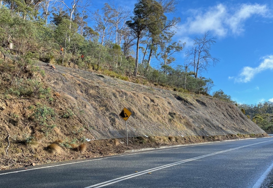 To prevent rockfall hazards on the Tasman Highway, Shaw delivered drape mesh installation over a steep 100-metre embankment at Break-Me-Neck Hill. The team used specialist access equipment and rope-based labour to complete the work safely and efficiently, while keeping the road open throughout. A practical, on-site testing method for anchors reduced delays and improved outcomes for both the client and the community.